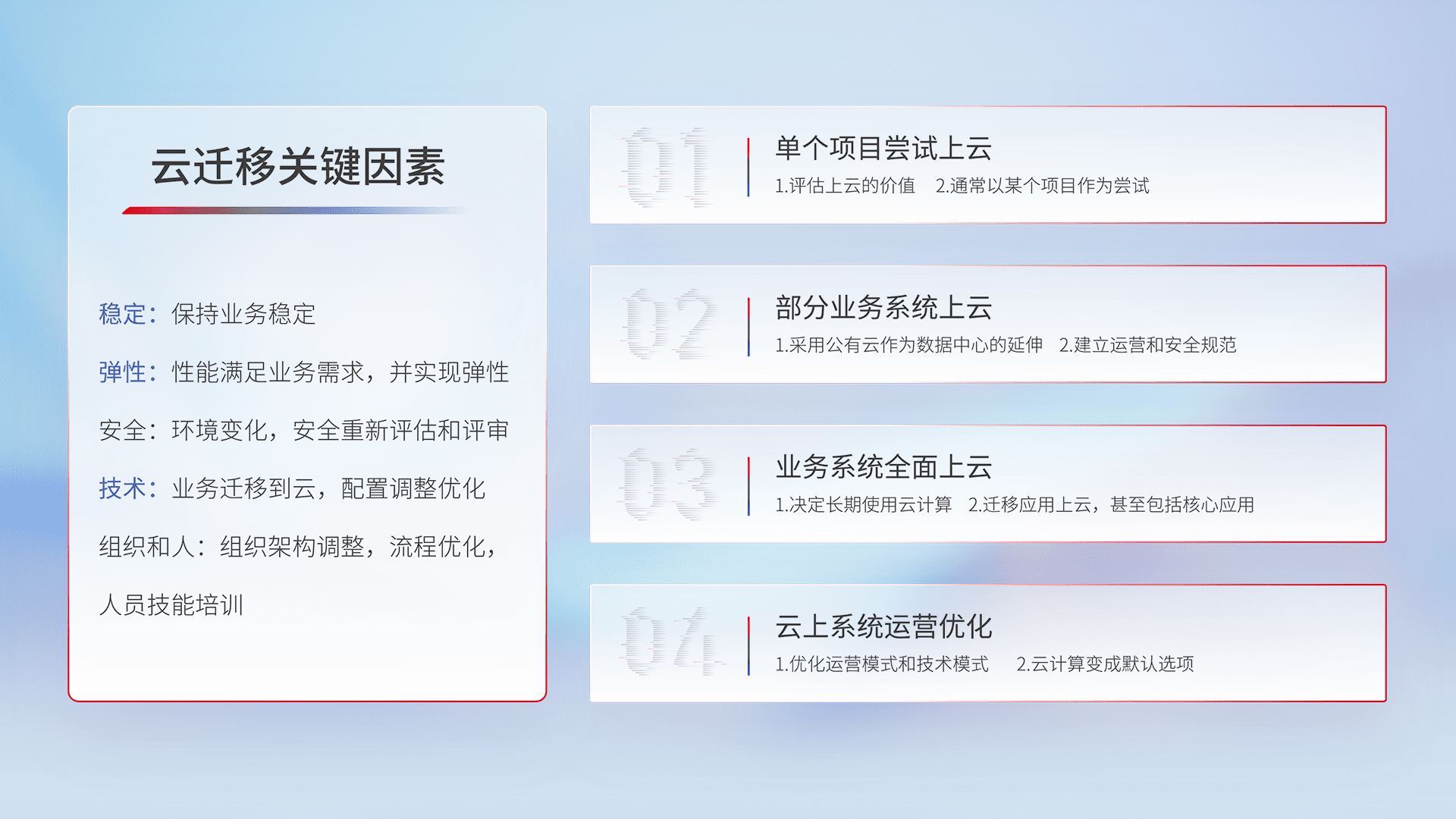 结合实际业务,,,,从规划设计、、、云平台选型、、云原生改造、、、数据迁移、、、、集成交付,,迁移全过程为客户识别最佳上云路径,,,做好风险识别管理,,设计网络架构、、、身份权限、、、安全审计合规、、、操作审计、、、、日志审计、、监控告警策略、、、、多站点容灾设计等,,,,对云上基础设施进行整体规划,,,提升IT治理水平,,,以满足弹性、、、、高可用、、、高性能的需求。。。。