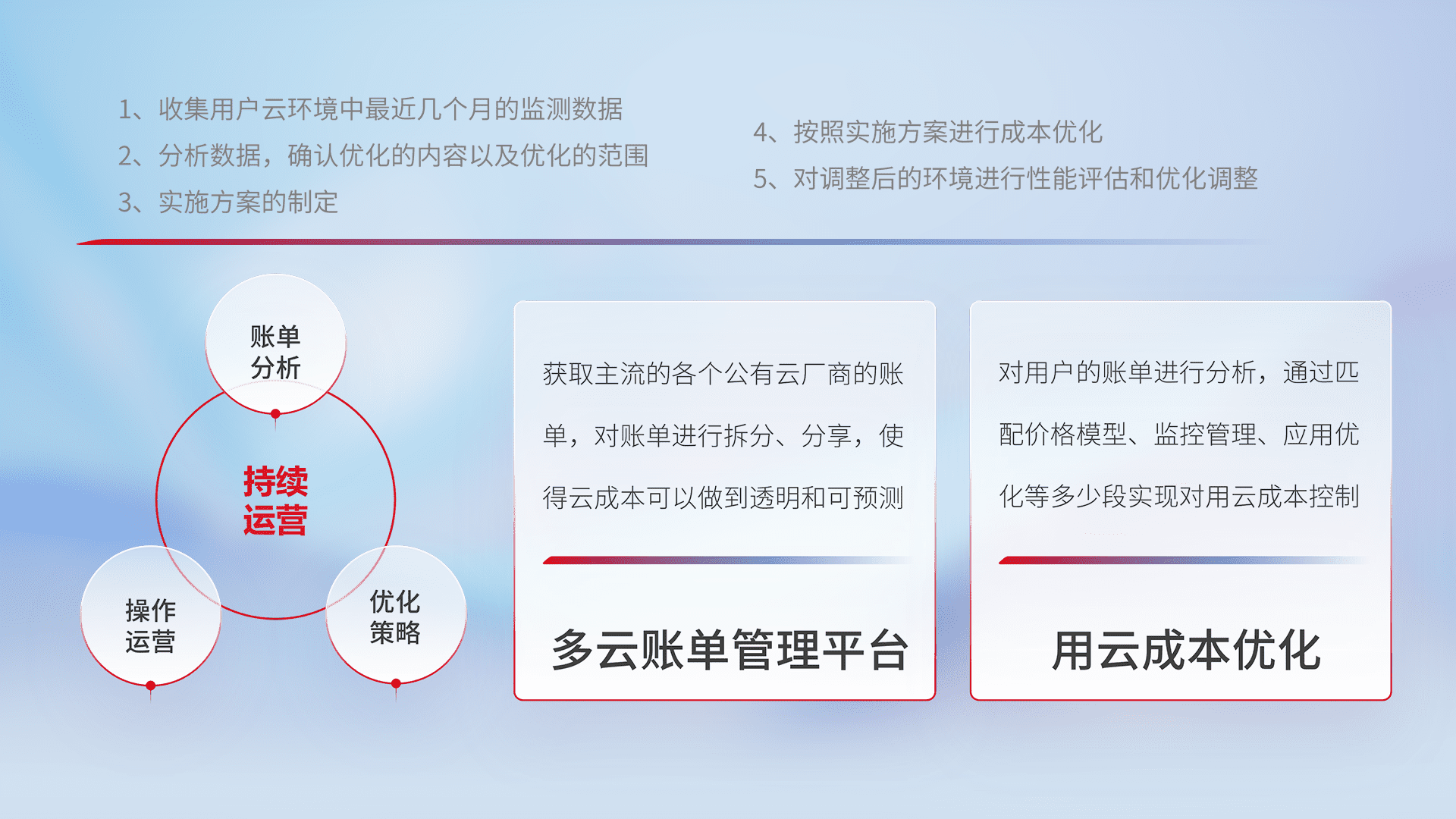 通过多云纳管,,,,以统一的资源数据模型把客户的云资源进行抽象和封装,,,进而实现对多云资源的统一操作,,,,保障云资源管理的可靠性、、稳定性与可用性。。。量身定制化运维内容,,配置、、开发运维、、、补丁管理、、、备份、、、监控、、、、认证和访问管理、、、审计和日常巡检等,,,,保障在用云过程中的可靠度,,,,稳定度以及高可用率。。。。